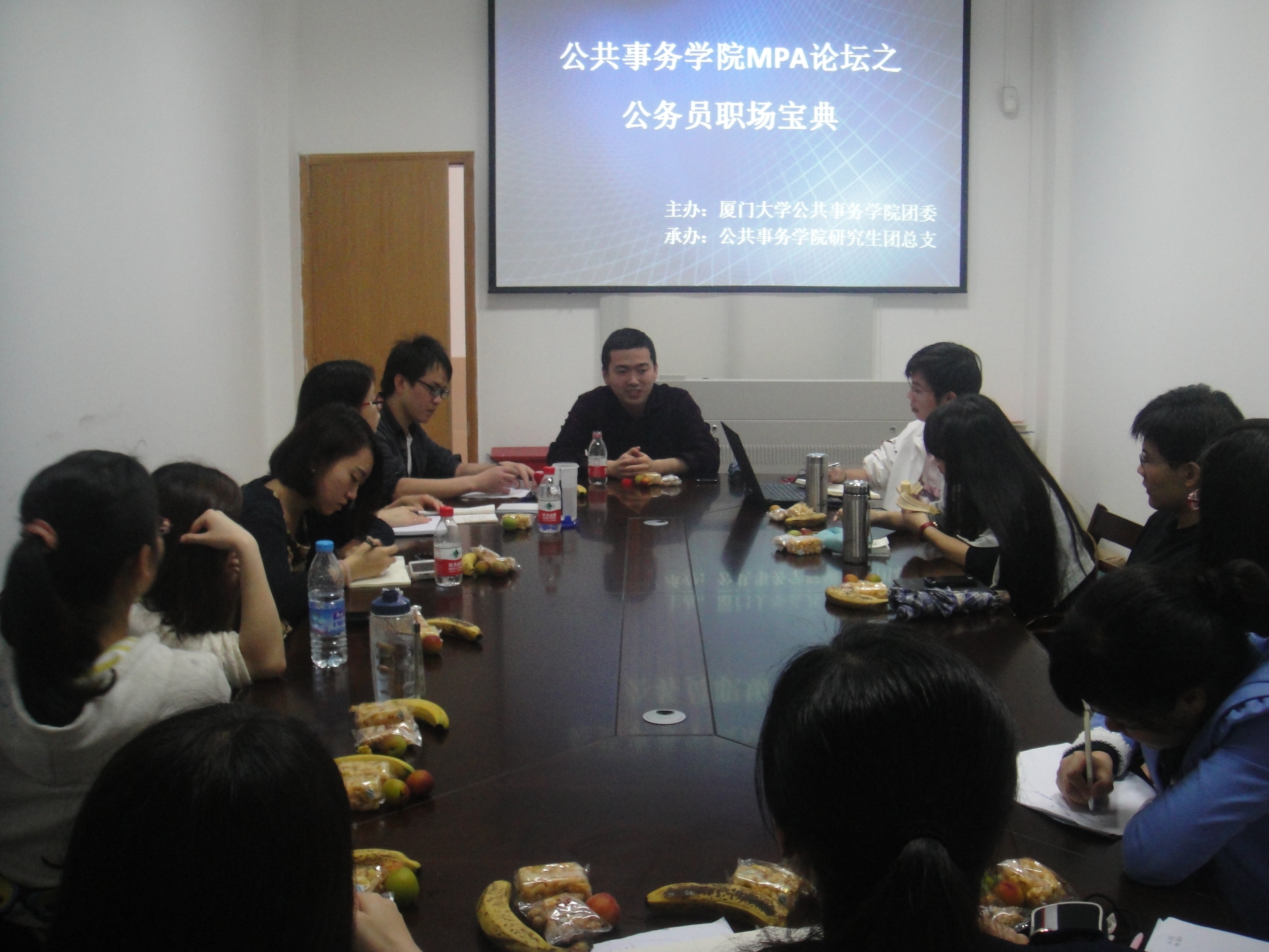 2014年4月26日,由公共事务团委主办,公共事务学院研究生团总支承办的“行政综合能力培养工程”之MPA论坛第三期于成智楼105教室成功举办。本次活动以公务员职场宝典交流会主题,诚邀就职于厦门市工商管理局信息技术管理分局的学院MPA学员黄渊昊与同学们分享他的职场经验。本次活动采取沙龙交流会形式,同学们根据自身兴趣报名。