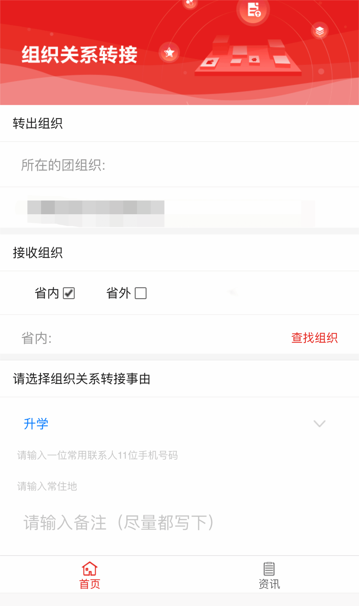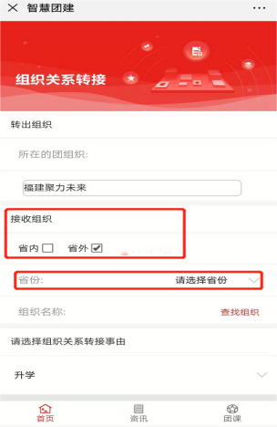 在“接收组织”的选择上,按照团员实际去向选择“省内”“省外”(2024年开始,取消“参军入伍”端口)。