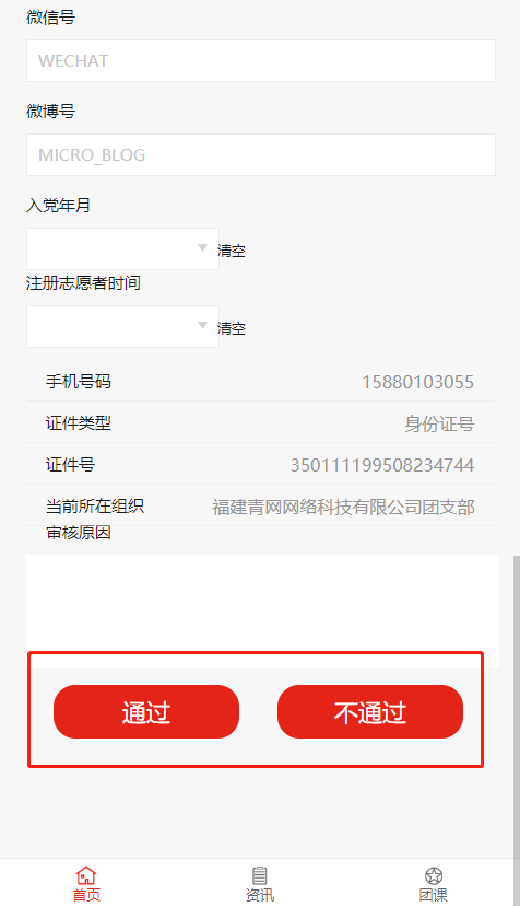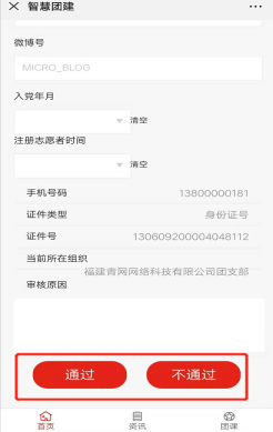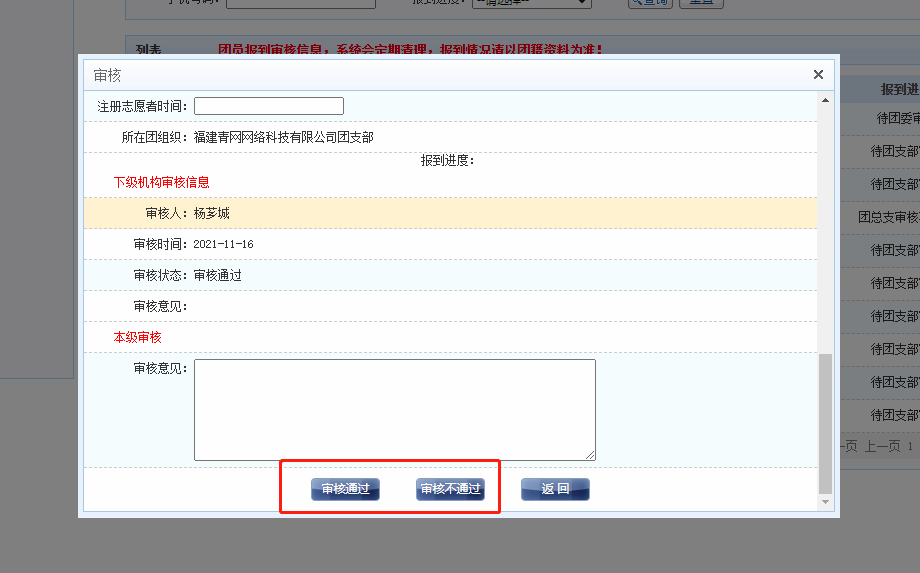 点击【审核通过】,即完成团员报到,点击【审核不通过】,则填写审核意见,待团员进行修改后重新审核。