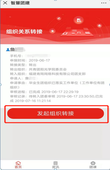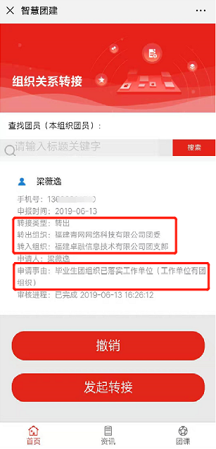 ②若新生团员的转接申请已完成审核流程,此时【发起转接】页面只有该新生团员的转接信息以及“发起转接”按钮,而没有“撤销”按钮。如下图所示: