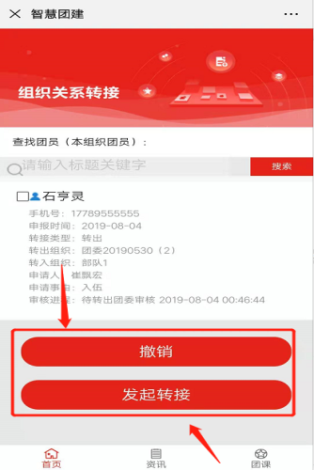 ①若新生团员已发起过转接申请,且审核流程未结束,此时,点击组织关系转接图标“