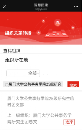 (1)查找组织。勾选“省内”后,点击“查找组织”,输入接收方团组织名称的关键词(本科新生团员:厦门大学公共事务学院2025级本科生临时团支部;研究生新生团员:厦门大学公共事务学院25级研究生临时团支部)进行搜索,选择相应的团组织进行转接(点击选择即可)。如下图所示:
