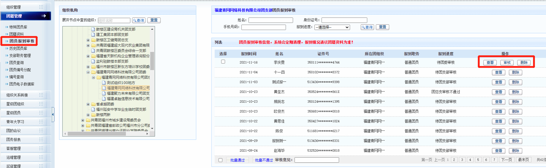 团总支审核通过后,团委管理员登录“福建智慧团建综合管理系统”,点击【团籍管理】-【团员报到审核】,选择对应支部,找到需要审核的团员,点击【审核】。