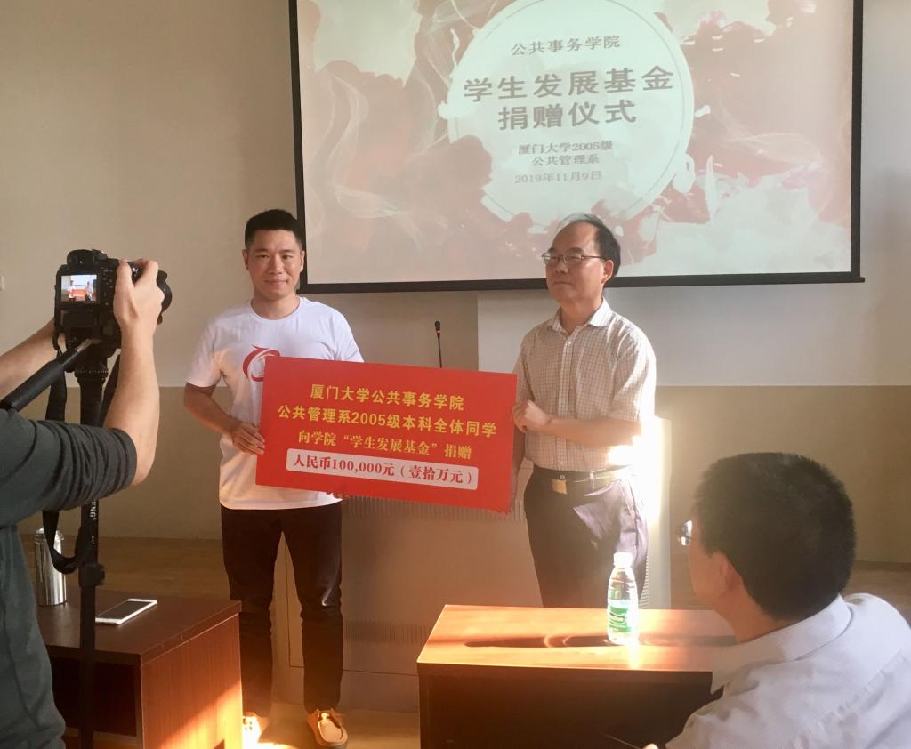 近年来,学院一直在筹划成立“学生发展基金”,经与学院领导、学校教育发展基金会沟通,2005级同学全体计划筹措一笔资金10万元作为第一批启动资金注入“学院学生发展基金”中,此项基金将用于学院学生今后到国外一流大学交流学习、国际组织实习担任义工、大型央企、国家部委实习以及社团活动、奖助学金等学生综合发展的资助经费。学院今后也将通过企业捐赠、校友捐赠、国家经费配套支持等方式不断充实壮大基金。 朱院长作为学院代表接受了05公管同学们的这份心意。