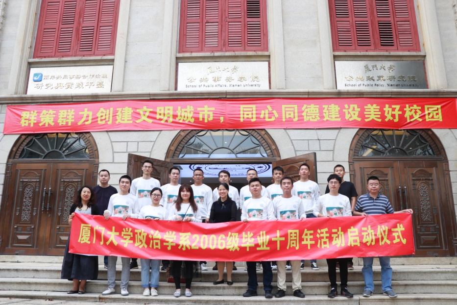 11月21日下午,公共事务学院政治学与行政学系2006级本科班级(以下简称2006政治班)举行毕业十周年活动启动仪式。学院院长朱仁显老师,副院长罗思东老师、李艳霞老师,政治学系系主任夏路老师,2006政治班时任班主任杨玲老师,教师代表李丹老师、王伟光老师、聂安祥老师参加活动。2006政治班在福建、广东地区工作的15名毕业生代表到校参加活动。