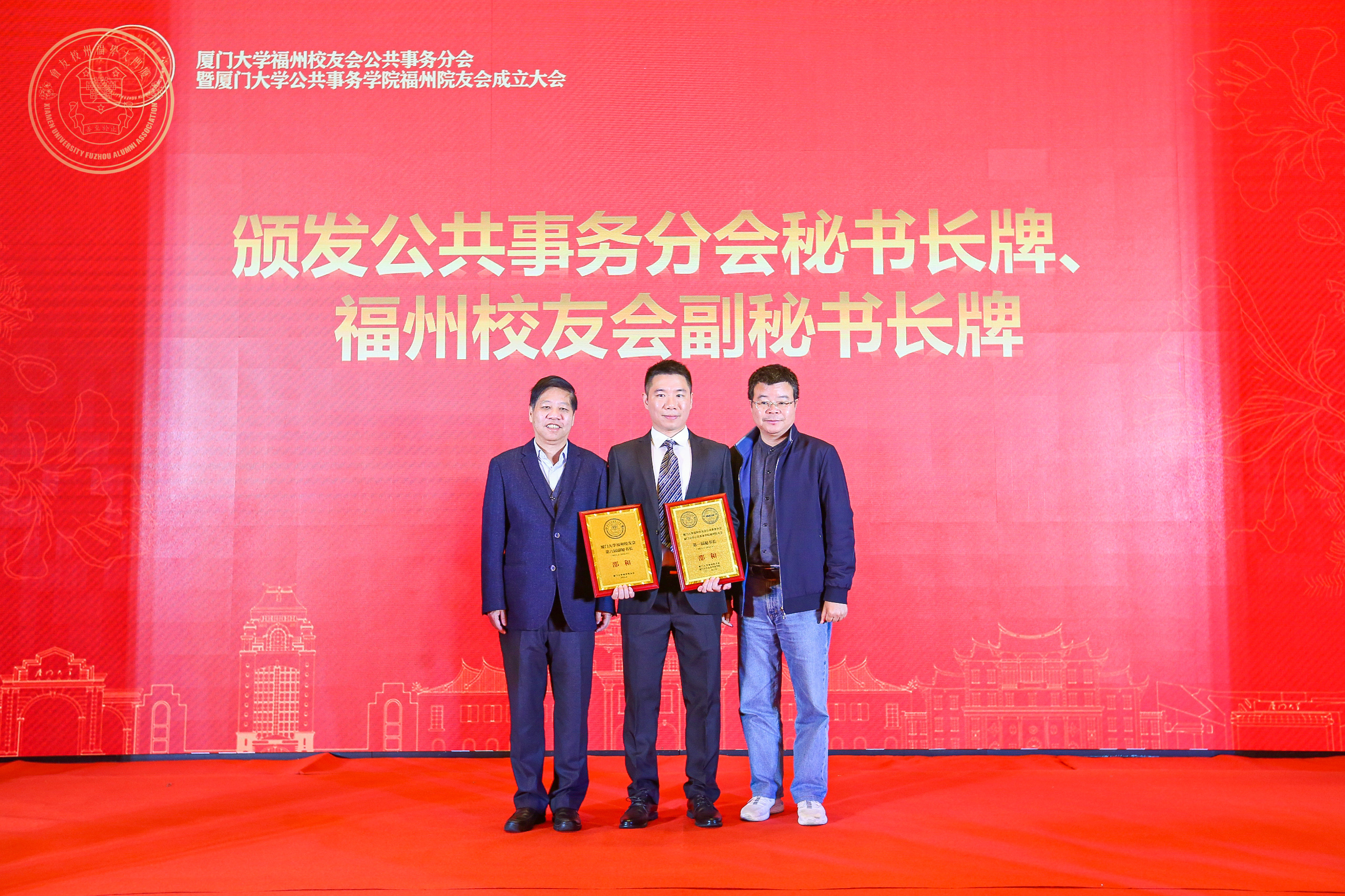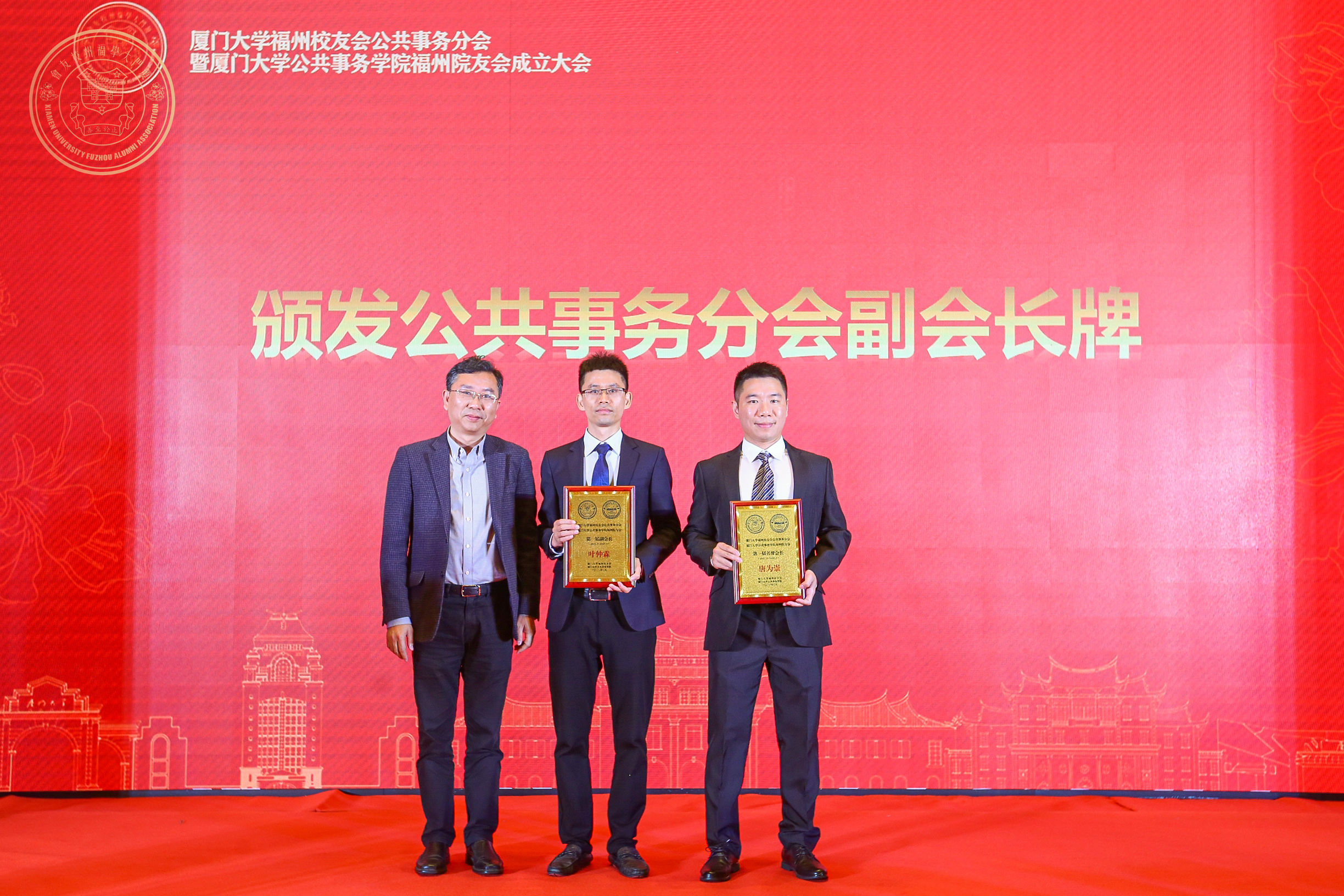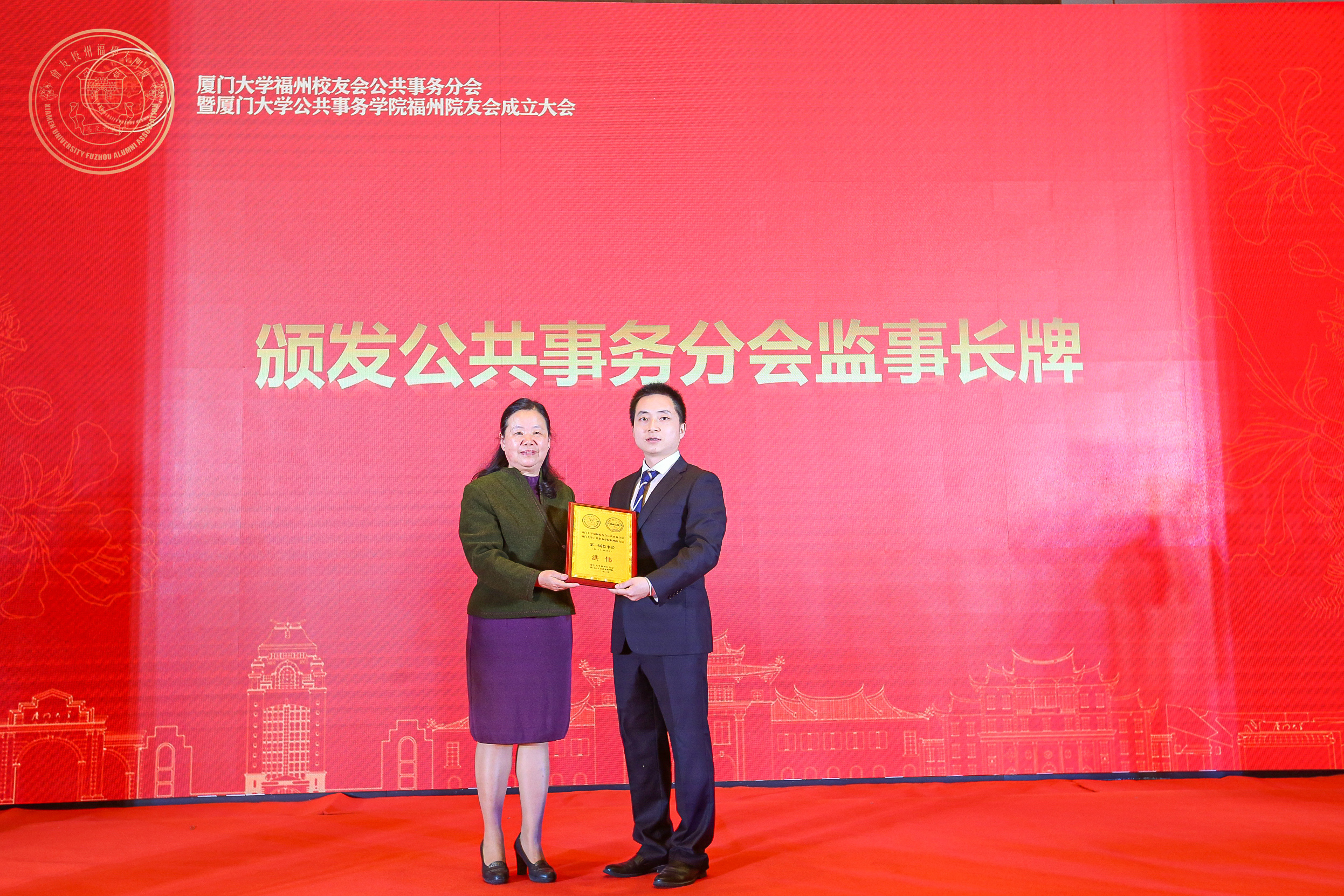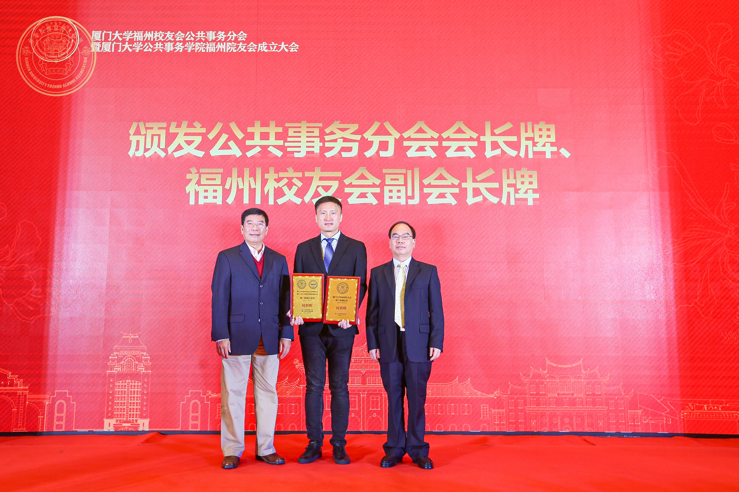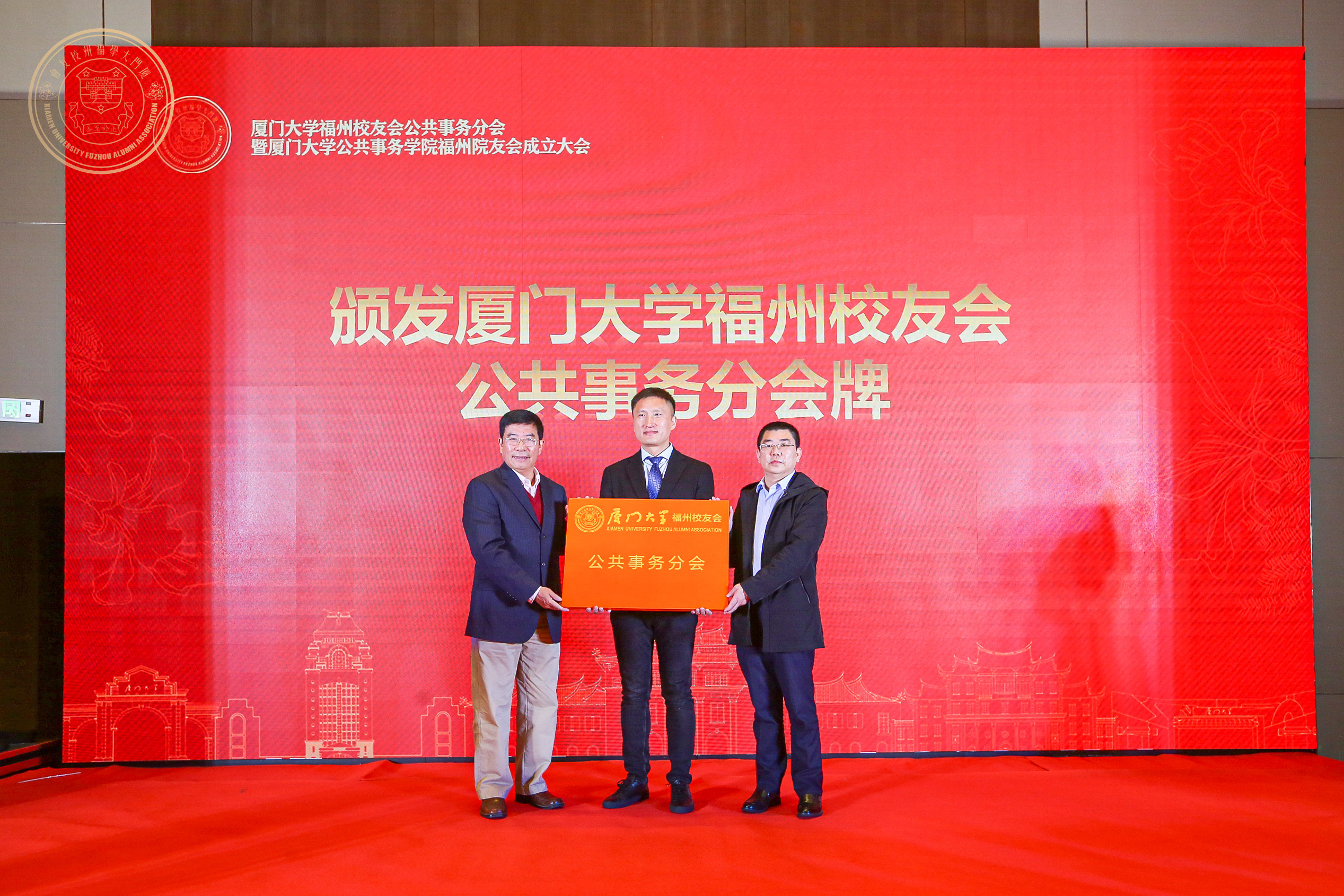 随后,会议举行院友会授牌仪式。厦门大学福州校友会原会长叶文振与厦门大学校党委政研室主任、发展规划办主任黄新华一同为公共事务分会执行会长何世晖颁发厦门大学福州校友会公共事务分会会牌。与会嘉宾和学院领导分别向执行会长、监事长、副会长、秘书长、副秘书长授牌。