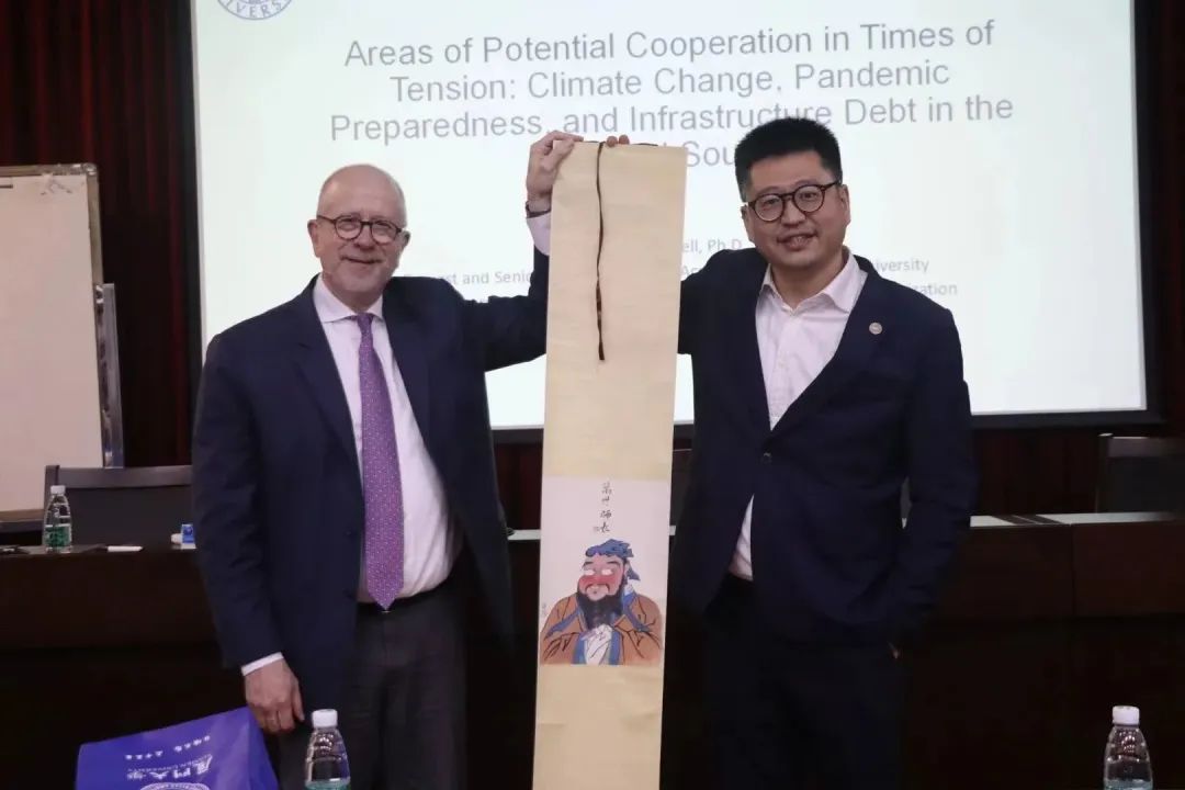 讲座结束后,我院师生与Birdsell校长展开了热烈的问答交流,讲座圆满结束。于文轩院长对讲座做了总结,他认为David Birdsell校长的讲座从情怀、视野、研究问题的提出、研究方法的选择,以至于幻灯片设计和汇报技巧等诸方面都给我们很多启发。讲座结束后,于院长向David Birdsell校长赠送了自己题为《万世师表》的画作,对David Birdsell校长长期以来对我们院的支持表示衷心的感谢,并合影留念。