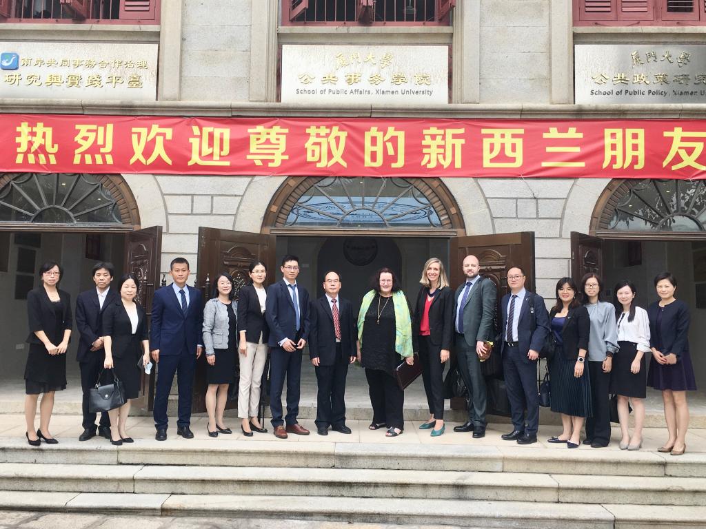 傅恩莱大使等一行首先到访、参观了公共事务学院及新西兰研究中心。公共事务学院院长朱仁显教授、新西兰研究中心主任王伟光副教授向大使一行介绍了学院及中心的基本情况和发展现状。陪同大使来访的还有新西兰驻广州总领事馆总领事沈立、,副总领事霍博安,福建省外事办领事处副处长林寒冰,厦门市外事办领事处处长曾金吉等人。学院和中心成员夏路、朱芳芳、聂爱霞、张庆才等老师也参加了此次活动以及后来的演讲与座谈。