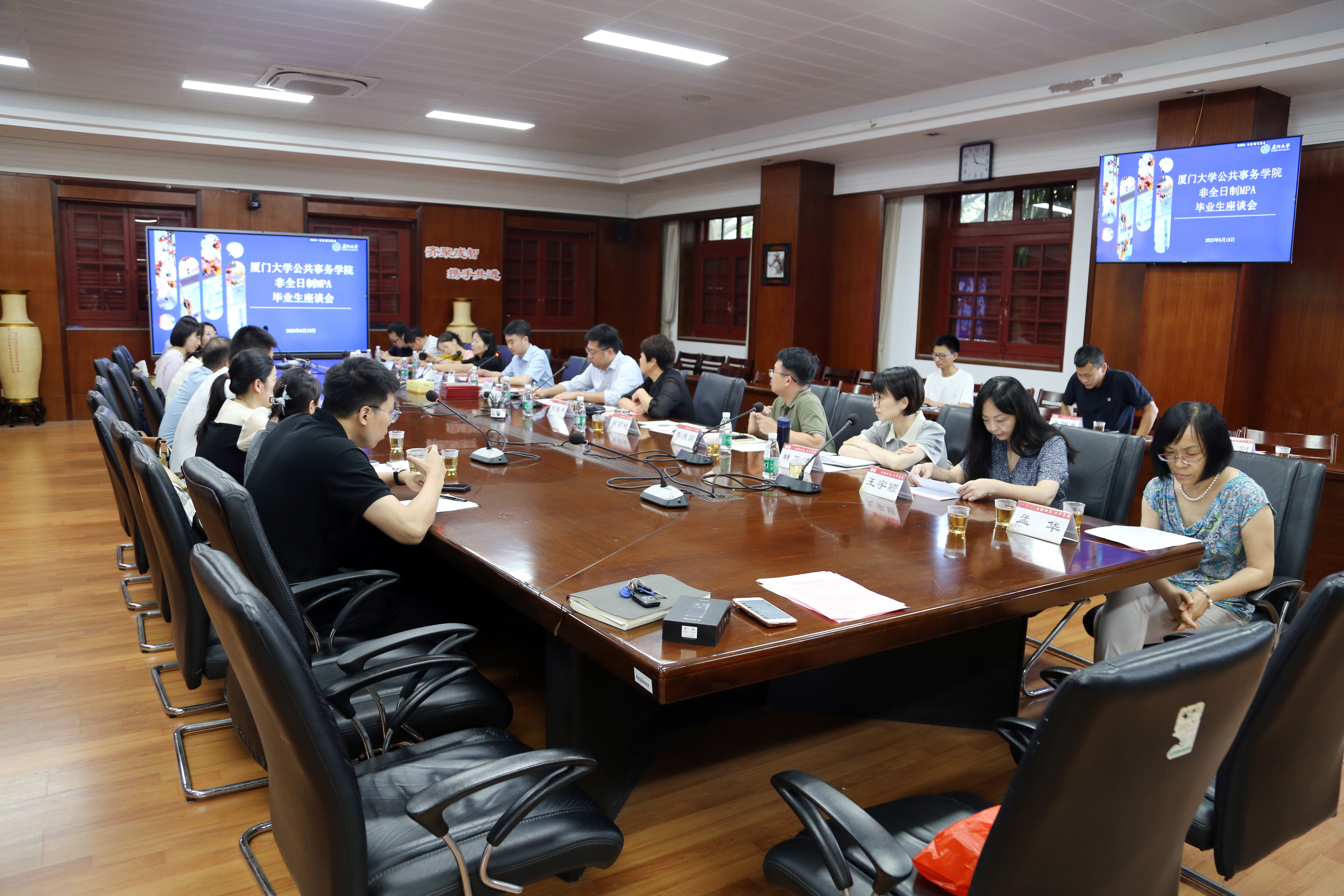 为积极响应党中央在全党大兴调查研究之风的号召,进一步加强毕业生与学校、学院的联系,6月19日上午,厦门大学MPA教育中心在成智楼301会议室召开2023届非全日制MPA毕业生座谈会。公共事务学院党委书记刘艳杰、院长于文轩教授、党委副书记魏丽艳教授、副院长罗思东教授、MPA中心副主任徐国冲教授与林亚清副教授、专任教师代表、MPA中心秘书以及非全日制MPA毕业生代表参加了本次座谈会,会议由徐国冲主持。