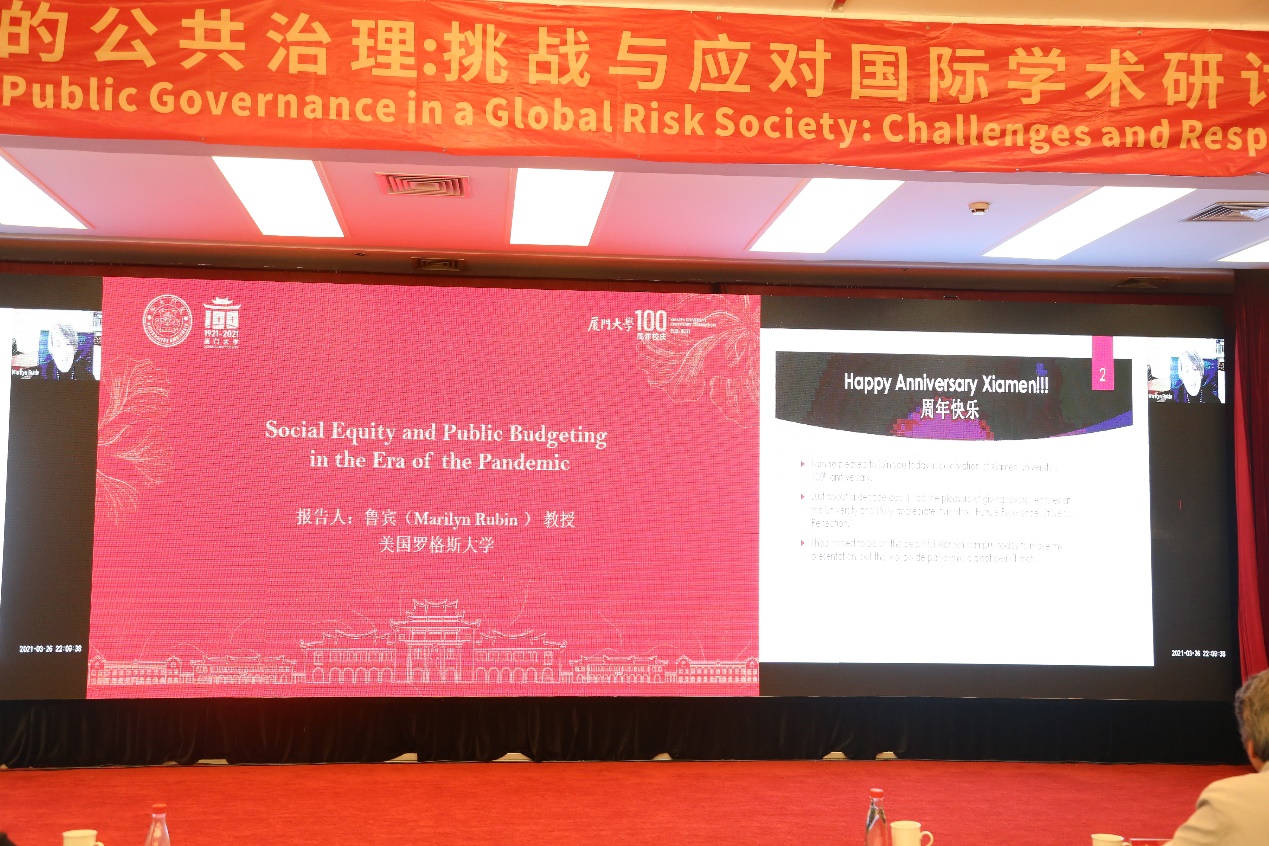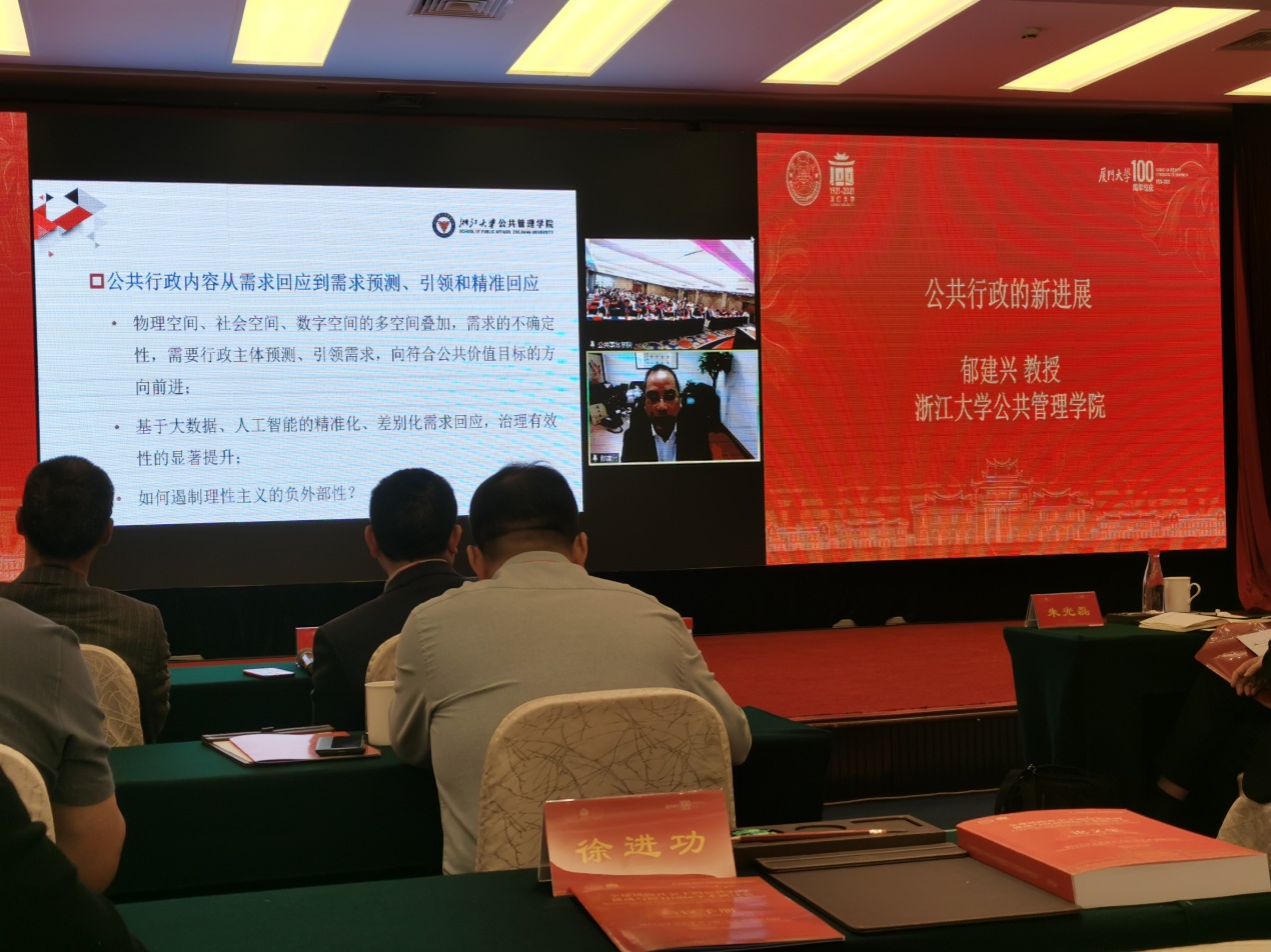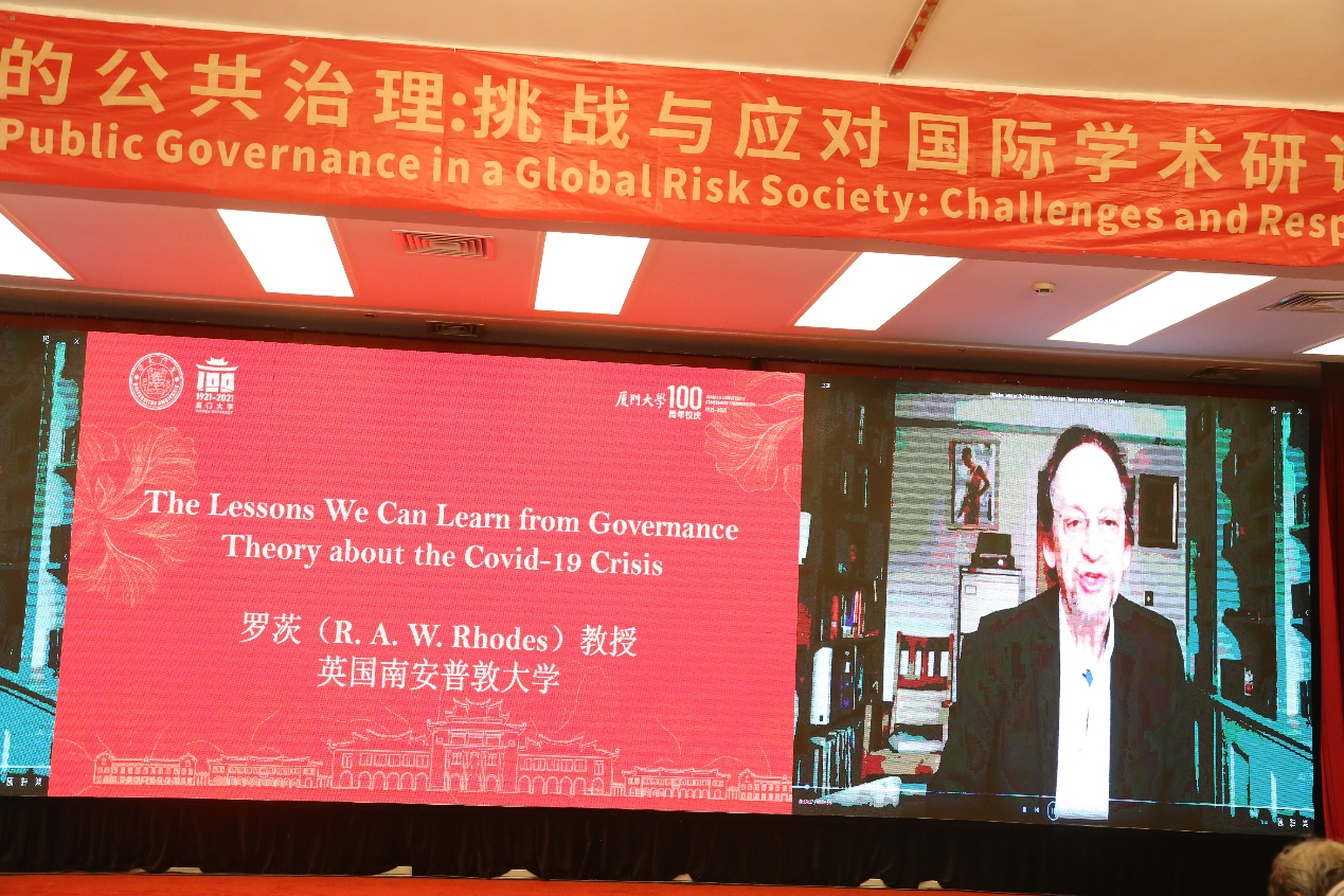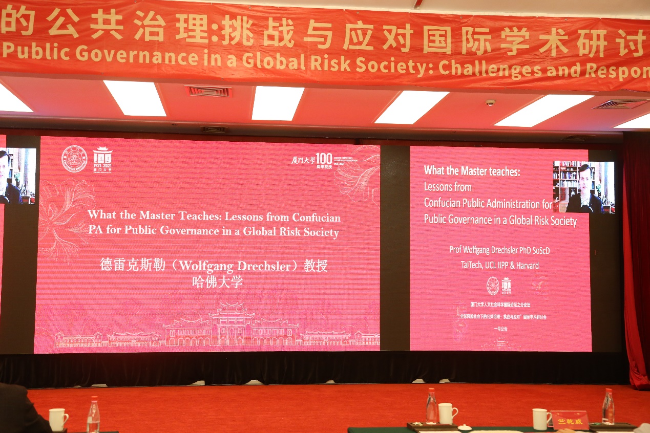 第二场主题报告由厦门大学公共事务学院高和荣教授和吕志奎教授主持,南京大学政府管理学院孔繁斌教授、中山大学政治与公共事务学院谭安奎教授、东北大学文法学院张雷教授、清华大学政治学系杨雪冬教授、哈尔滨工业大学公共管理系米加宁教授、美国萨福克大学霍哲教授、英国南安普敦大学罗茨教授、阿肯色大学隋殿志教授、哈佛大学德雷克斯勒教授和罗格斯大学鲁宾教授分别作题为《政府治理创新改变了官僚制组织吗》《国家治理中的还原论思维及其风险》《社区治理“两邻理论”与中国式社区防疫实战》《风险超载、治理“辖区化”限度与善治的空间路径》《“第四次工业革命”与“数字空间”政府》《治理的未来》(The Future of Governance)《人类从新冠疫情危机治理理论中学习的经验教训》(The Lessons We Can Learn From Governance Theory about the Covid-19 Crisis)《公共治理的全球风险与挑战》(Emerging Global Risks and Challenges of Public Governance)《大师教什么:全球风险社会儒家公共行政为公共治理提供了什么教训》(What the Master Teaches: Lessons from Confucian PA for Public Governance in a Global Risk Society)《疫情大流行时代的社会公平与公共预算》(Social Equity and Public Budgeting in the Era of the Pandemic)的主旨演讲。