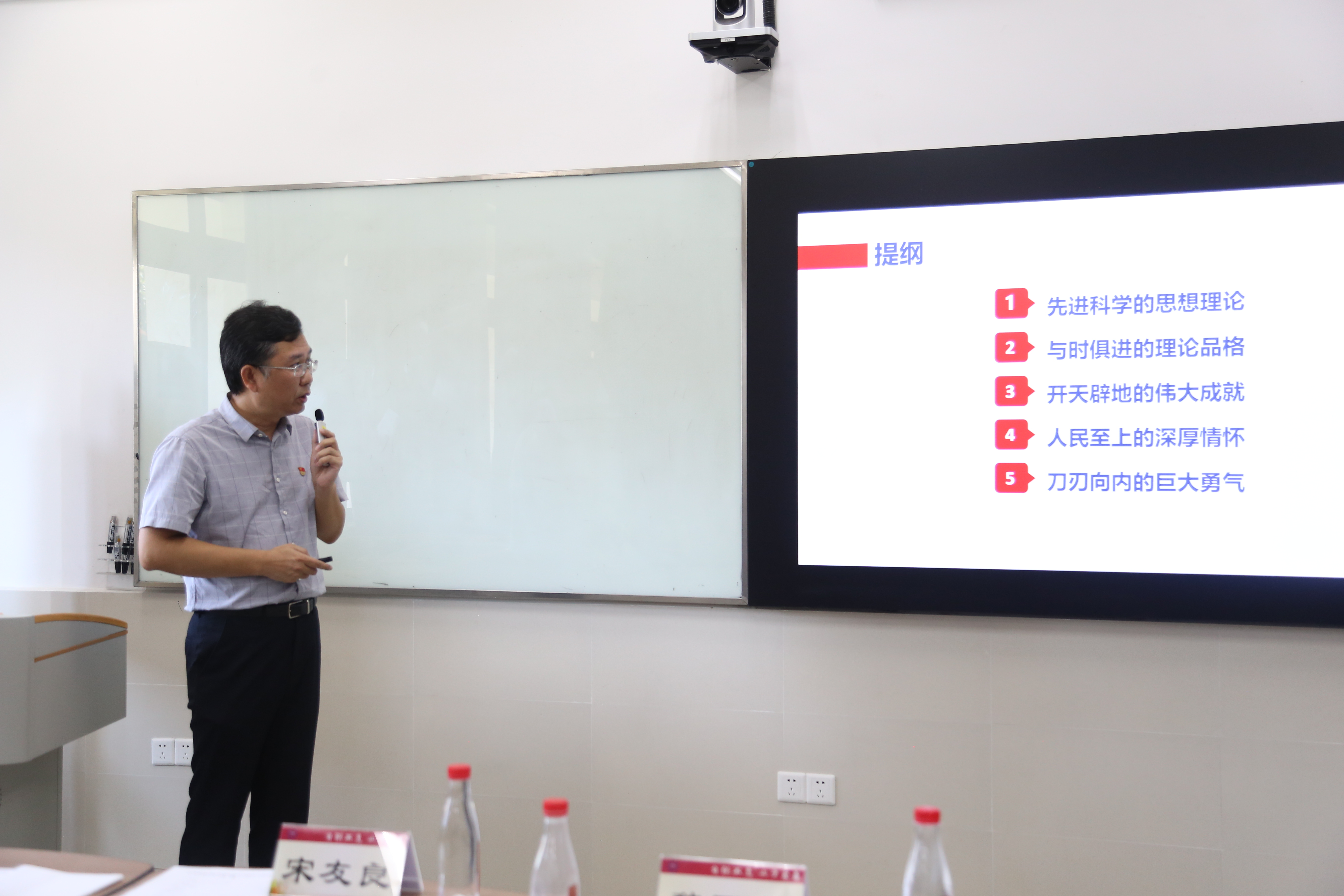 结合学习党史的体会,宋友良从先进科学的思想理论、与时俱进的理论品格、开天辟地的伟大成就、人民至上的深厚情怀、刀刃向内的巨大勇气五个方面谈了对中国共产党先进性的理解。他表示,先进科学的思想理论是先进性的根本,全体师生要深入理解把握马克思主义中国化的一系列成果特别是习近平新时代中国特色社会主义思想的科学性、真理性,系统掌握贯穿其中的马克思主义立场、观点、方法,并用以分析社会现象、开展学术研究、指导具体工作;与时俱进的理论品格是先进性的动力,全体师生要传承我们党应对时代挑战开展理论创新的勇气和自觉,结合公共管理、政治学学科特点,自觉加强理论武装,努力为党的理论创新、制度创新,推动我国治理能力和治理体系现代化发声出力;开天辟地的伟大成就是先进性的表现,全体师生要深刻认识中国红色政权来之不易,新中国来之不易,中国特色社会主义来之不易,坚定听党话跟党走;人民至上的深厚情怀是先进性的根基,全体师生要从党的历史和脱贫攻坚、疫情防控中深刻认识中国特色社会主义制度所具有的显著优势和我们党为人民服务的根本宗旨,不断坚定“四个自信”,涵养为民情怀;刀刃向内的巨大勇气是先进性的保证,全体师生要深刻认识全面从严治党的重要意义和取得的巨大成就,自觉以党章党规严格要求自己,强化底线意识,在师生中树立良好党员形象。