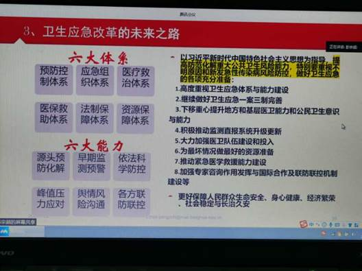 本场讲座基于新冠肺炎疫情的相关数据,结合相关研究与调研成果,并运用数据、图表以及视频等多样的方式,介绍了我国当前卫生应急管理体系与能力建设的成就与主要问题,提出要坚持以习近平新时代中国特色社会主义思想为指导,提高防范化解重大公共卫生风险能力。