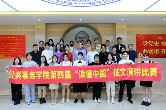 为促进青年学生深入学习十九届六中全会精神和习近平总书记在庆祝中国共青团成立100周年大会上的重要讲话精神,迎接党的二十大胜利召开,使更多大学生深切感悟中国共产党的历史担当,坚定听党话、跟党走的信念与决心,按照学校开展“四史”教育活动的工作要求,厦门大学公共事务学院5月27日晚在成智楼108成功举办第四届“读懂中国”征文演讲比赛。校团委副书记梁振伟、信息学院团委副书记刘茜、建筑与土木工程学院团委副书记林婕、外文学院团委副书记蔡宇、学生工作部(处)教育科谢婷婷等五位老师担任现场评委,公共事务学院党委副书记林盛铨、学工组徐莹、苏毅辉、李思颖等老师出席。