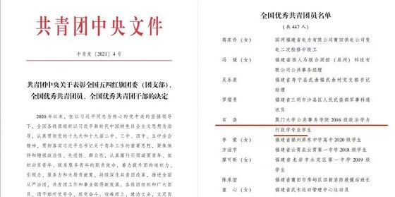 新一届“中国青年五四奖章”“福建青年五四奖章”名单揭晓,我院2016级政治学与行政学专业石浩获评2020年度“全国优秀共青团员”称号。