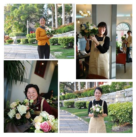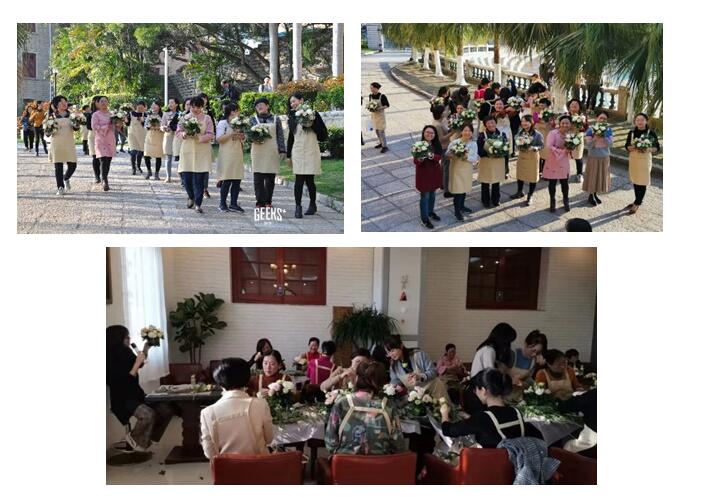 活动伊始,插花老师首先给在座的教师们介绍了花卉和基本的插花知识,随后大家纷纷行动起来,取材、减叶、构图,边学边练,时时进行交流探讨,现场气氛十分活跃。在插花老师的细心指导和小助手的帮助下,老师们用灵巧的双手,将原本普通的花叶根据不同的色彩和形状巧妙组合,构成了一幅幅独具匠心又饱含深意的美丽画卷。
