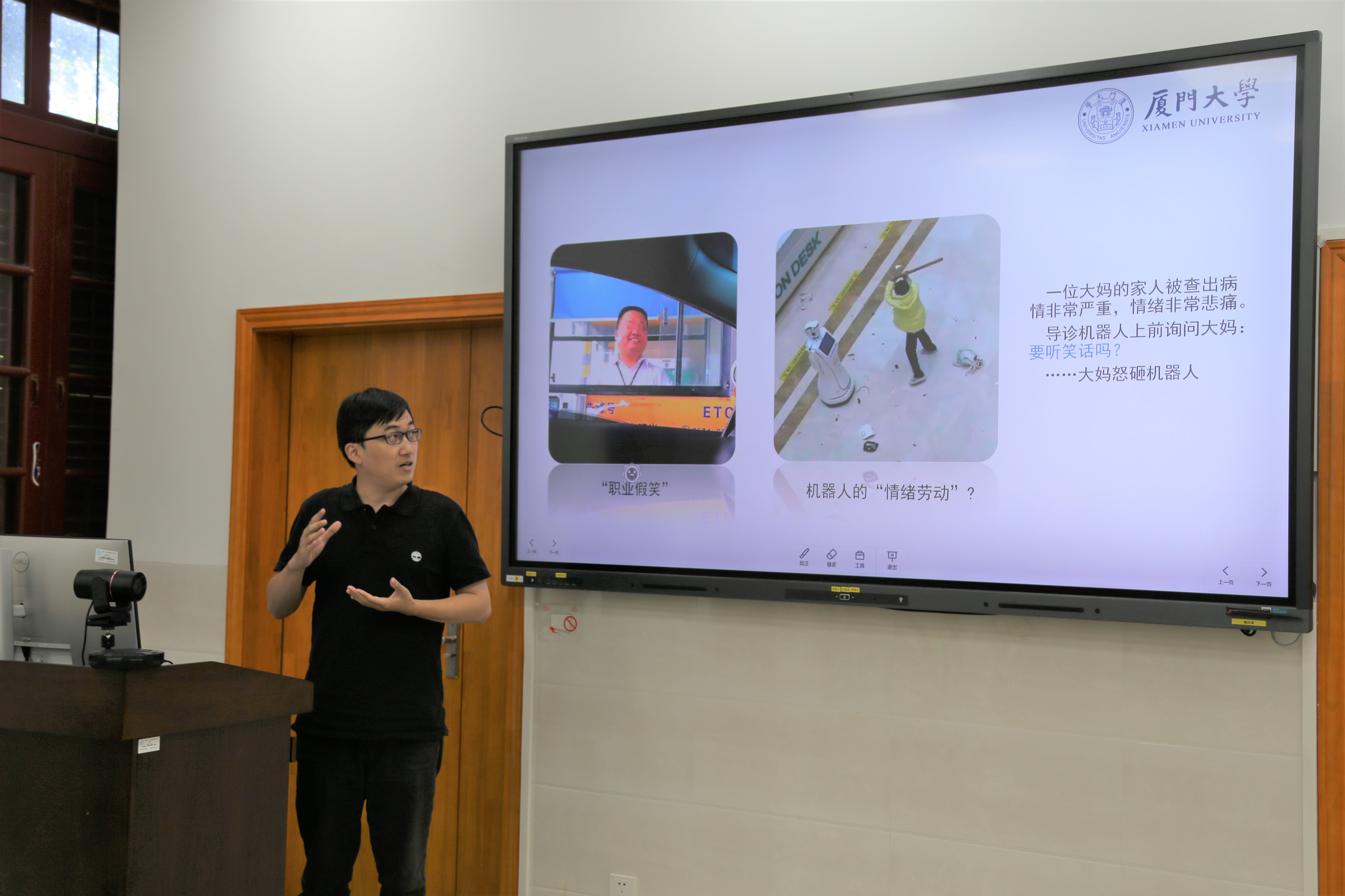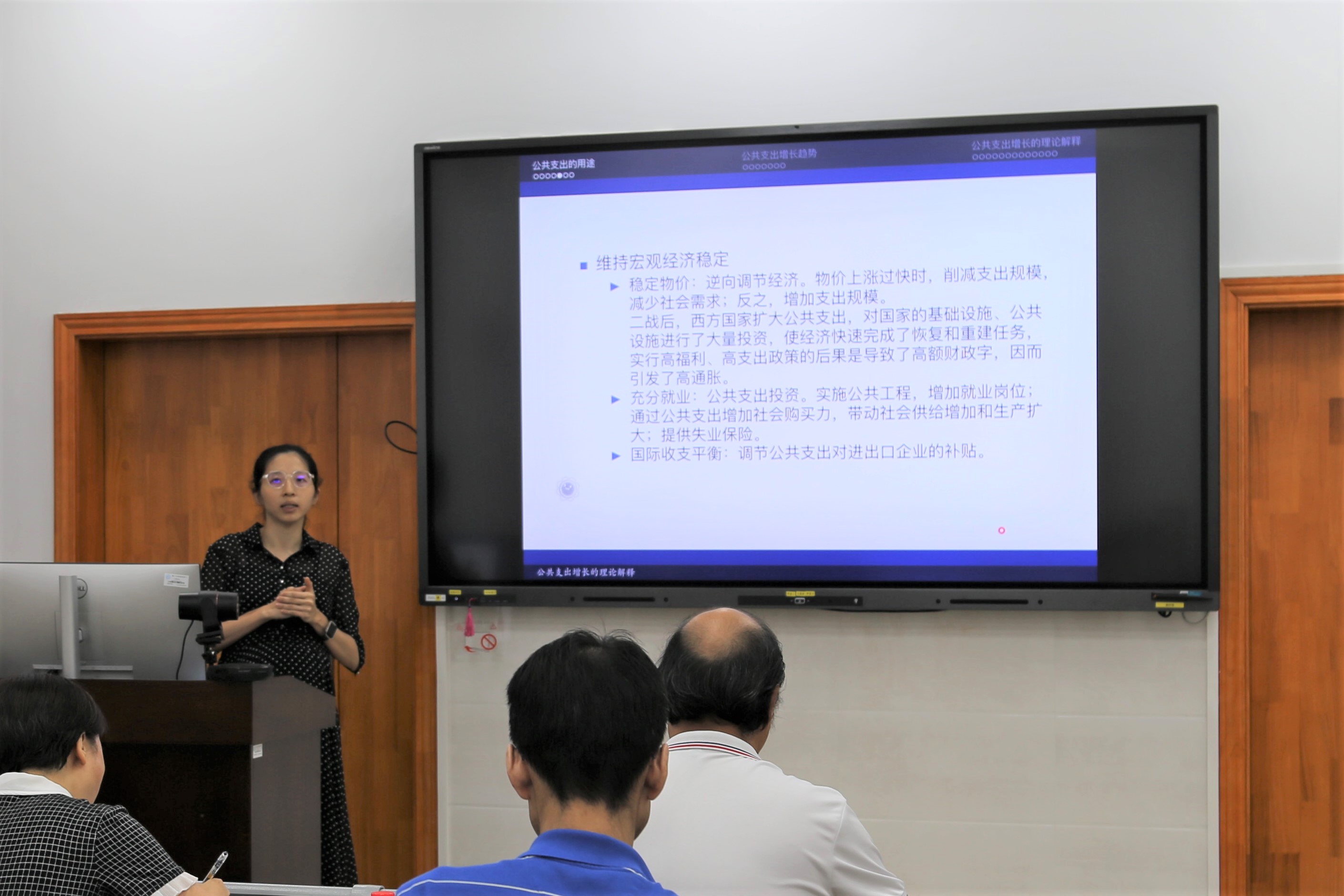 在教学展示环节,四位老师结合课程主题精心设计教学内容,课程讲授妙趣横生,在有限的二十分钟内呈现出一场场精彩的教学盛宴。刘建政以“计算公共政策学课程介绍”为主题,系统地介绍了计算公共政策课程的课程缘起、内容纲要,并结合社会热点分享了计算公共政策的研究与应用。林菡馨以“公共支出增长的理论解释”为主题,从我国公共支出水平变化的案例入手,讲授了有关公共支出增长的理论以及最新研究成果。任舒怀的授课主题为“重启古典政治哲学政体范式politeia”,他以贝尔纳多·扎卡的困惑为引子,展开了对什么是“古典整体论”以及为什么要重启“古典整体论”的探讨。徐浩分享的课程为“《管理心理学》课程之情绪劳动”,他从情绪劳动理论的缘起与发展延伸到公共服务中的情绪劳动的概念、前因、影响因素以及情绪劳动带来的后果。