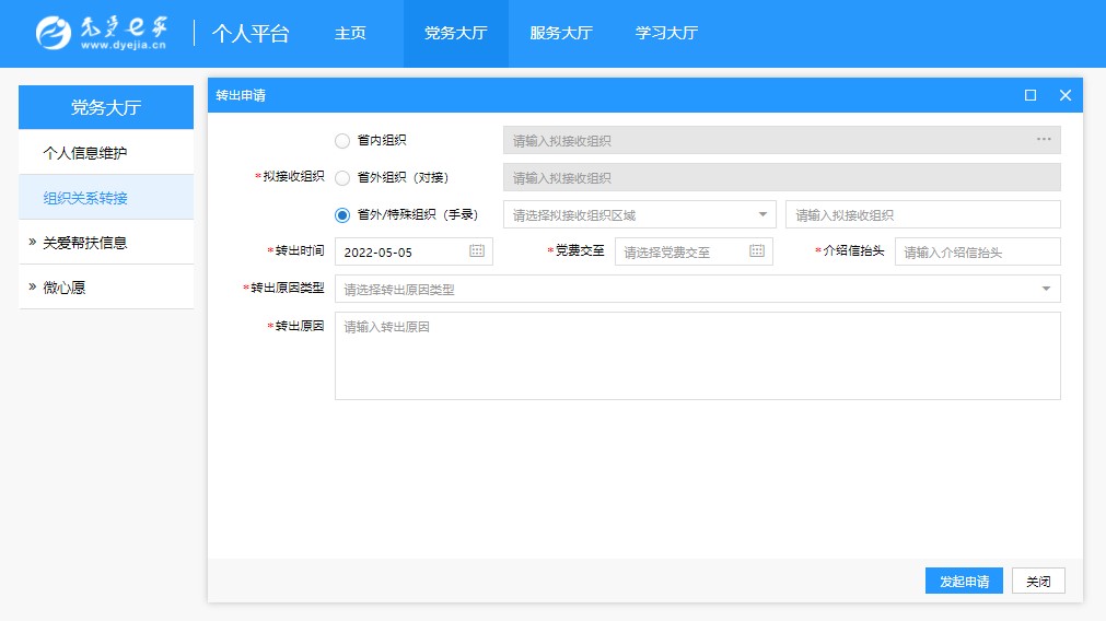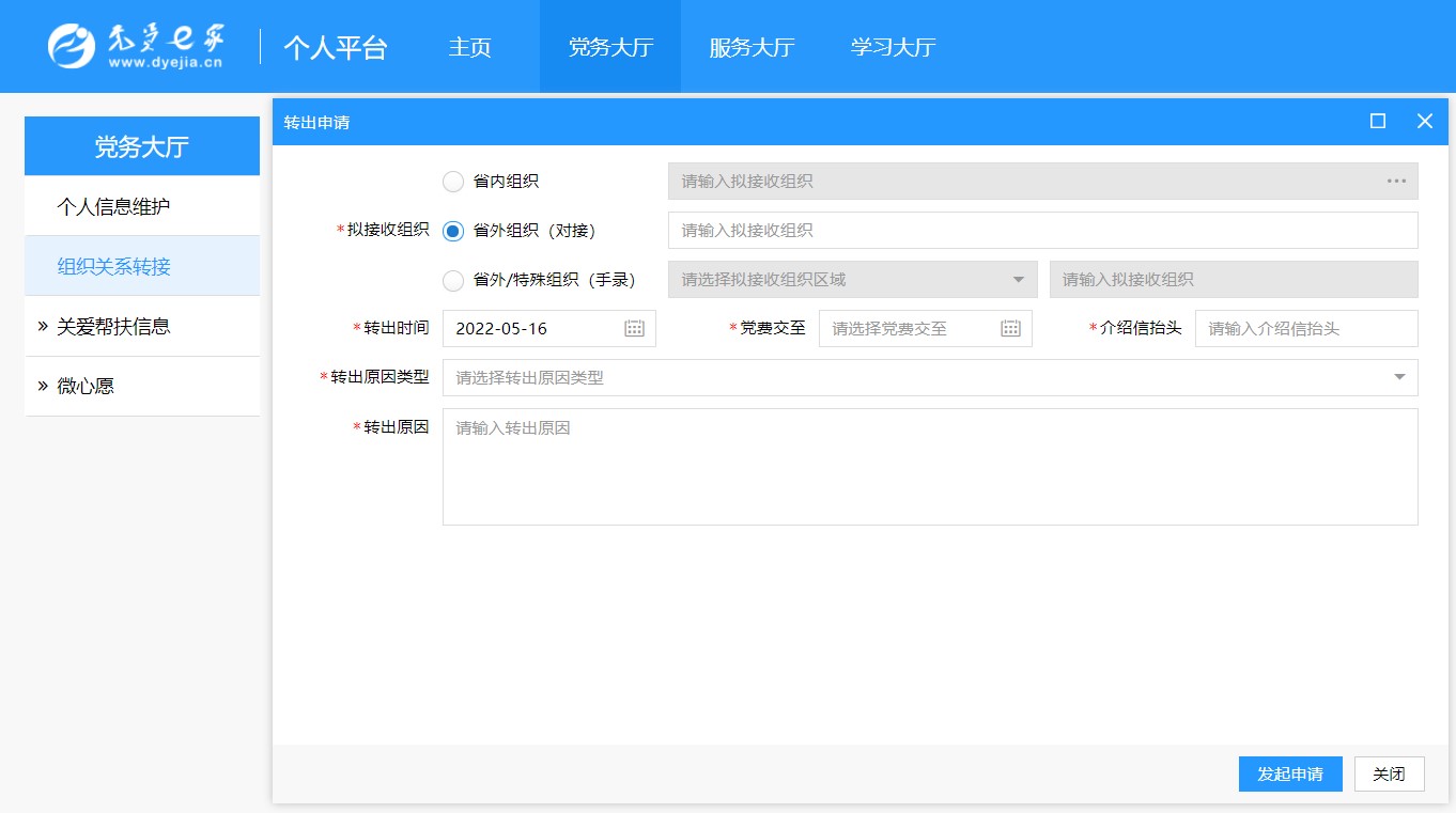 党员登录“党员e家”平台(www.dyejia.cn)→点击“登录”→登录个人平台→进入“党务大厅”→选择“组织关系接转”→点击“申请”→选择“省外组织(对接)”→填写拟接收组织名称(咨询拟转往单位)→填写“转出时间”→填写“党费交至”时间→填写“介绍信抬头”(咨询拟转往单位)→填写“转出原因类型”→填写“转出原因”→点击“发起申请”。即可发起在线转接流程,提交后由各级党组织管理员进行在线审批。党员要提醒接收地党组织及时办理和确认网上审批程序。